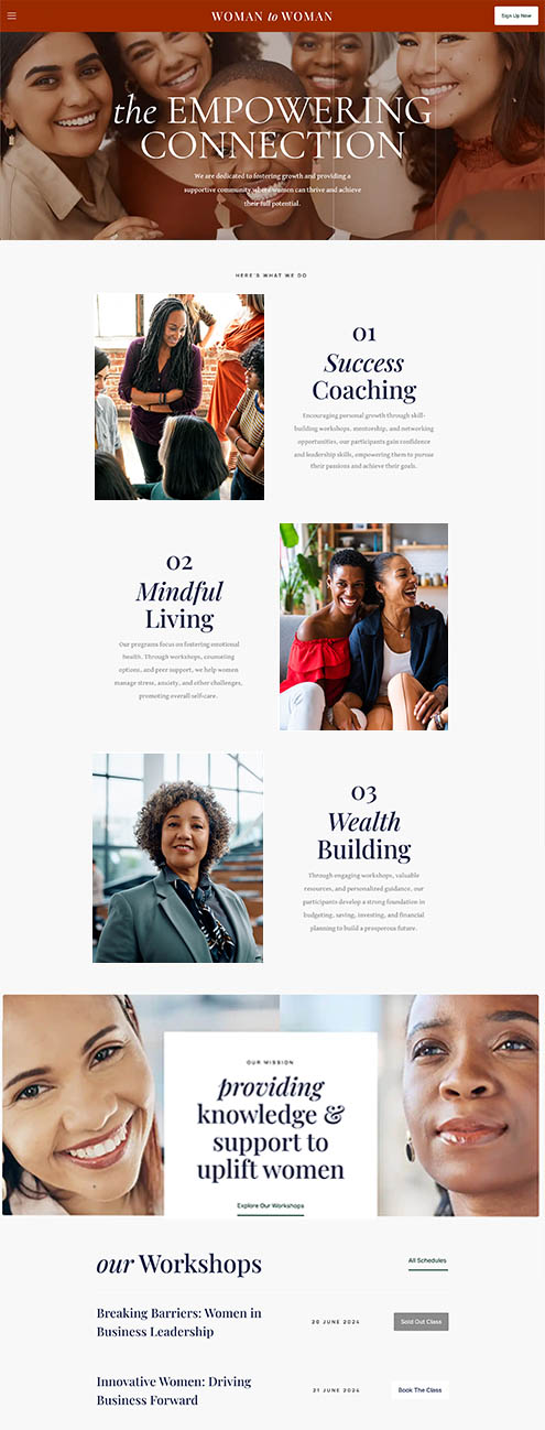Design an unconventional yet user-friendly website for a nonprofit charity. The objective was to create an innovative platform with a simple and modern design that effectively communicates the brand’s values while showcasing visually appealing content—without resembling a typical charity website. The core message emphasizes “empowering women through financial independence, emotional resilience, and personal growth.”